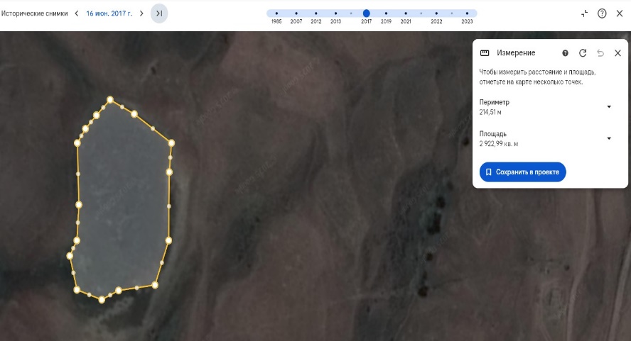 Тавассути абзори Google Earth муайян гардид, ки дар зарфи 10 сол масоҳати обанбор қариб як маротиба кам шудааст. Дар аксе, ки 10.06.2007 гирифта шудааст, дидан мумкин, ки масоҳати умумии оби кӯл 4570 м2 (расми 3)-ро ташкил медиҳад, вале вақте ба акси дуюм, ки 16.06.2017 гирифта шудааст, назар афканем, масоҳати оби кӯл то 2922 м2 кам гардидааст. Пас, маълум мегардад, ки масоҳати кӯл бо фарқияти 10 сол ба таври назаррас кам шудааст (расми 4).