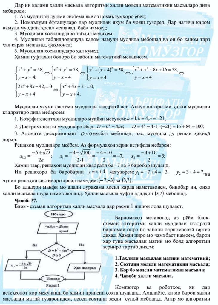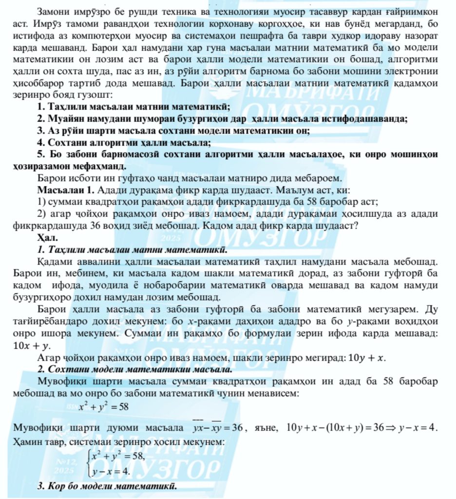 Мақолаҳо Таълимӣ - методӣ НАҚШИ МАТЕМАТИКА ДАР РУШДИ ЗЕҲНИ СУНЪӢ 07.04.2026 Шамсияи МАШРАБ, омӯзгори фанни математикаи МТМУ №31-и ноҳияи Восеъ, вилояти Хатлон Продолжить чтение Назад Предыдущая запись: МЕТОДИКАИ ТАШКИЛ НАМУДАНИ ҶАМЪИЯТИ ХИМИКОН ДАР МУАССИСАҲОИ ТАЪЛИМӢДалее Следующая запись: ЗЕҲНИ СУНЪӢ: ИМКОНИЯТ ВА ДУРНАМОИ ОН Добавить комментарий Отменить ответВаш адрес email не будет опубликован. Обязательные поля помечены *Комментарий * Имя * Email * Сайт Сохранить моё имя, email и адрес сайта в этом браузере для последующих моих комментариев. Дигар маводҳо ЗАРБУЛМАСАЛУ МАҚОЛ: АЗ ЗАМОНИ СОСОНИЁН ТО ДАВРОНИ ИСТИҚЛОЛ 07.04.2026 МУАЛЛИМАИ АВВАЛИНИ МАН 07.04.2026