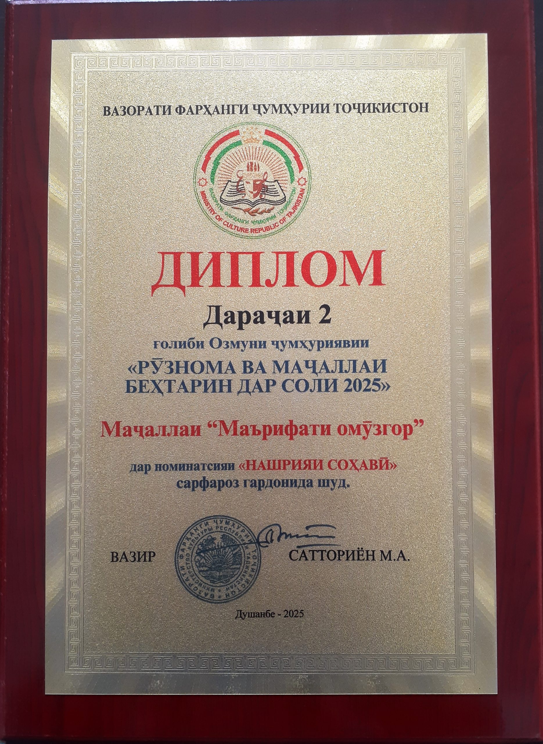 Дастоварди чашмгири дигар ин дар Озмуни ҷумҳуриявии «Рӯзнома ва маҷаллаи беҳтарин дар соли 2025», ки аз ҷониби Вазорати фарҳанги Ҷумҳурии Тоҷикистон ташкил ва роҳандозӣ гардид, аз рӯйи номинатсияи «Беҳтарин нашрияи соҳавӣ» мақоми дуюмро касб намудан ва соҳиби Диплом гардадинаи маҷалла мебошад, ки бозгӯи кори пурсамар ва эътирофи маҷалла дар сатҳи ҷумҳурӣ аст.