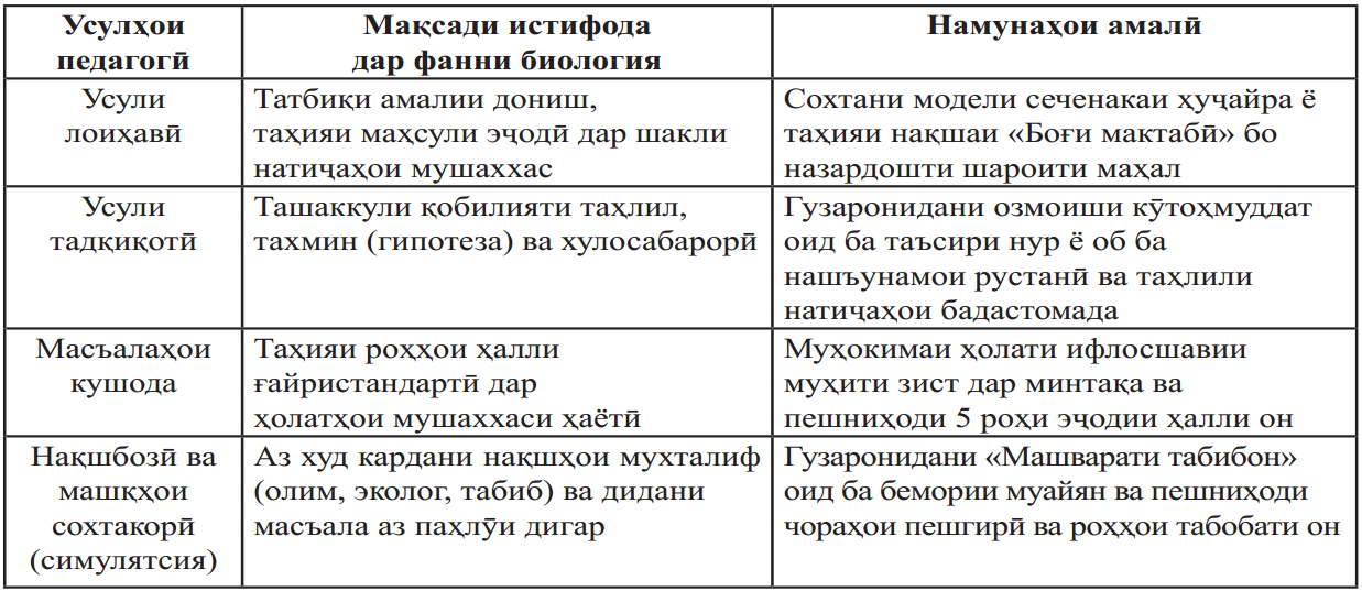 - Истифодаи маводди маҳаллӣ. Барои ташаккули тафаккури эҷодӣ, масъалаҳои биологиро бо ҳаёти воқеии хонандагон алоқаманд кардан муҳим аст. Масалан, таҳқиқоти гиёҳҳои шифобахши маҳалли зист ё омӯзиши олами ҳайвоноти минтақаи худ.