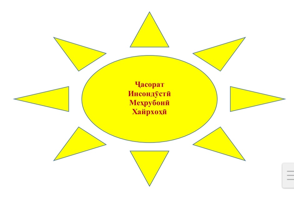 - Фарз намоед, ки бо интихоби бошууронаи касб дар зери нури офтоби пурасрор қарор доред ва он кадом хислатҳои арзанда ва ҳамидаи инсониро дар шумо такмил медиҳад. Дар нурҳои офтоб онро нависед: