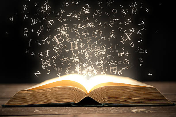 Open book and magical glowing letters.